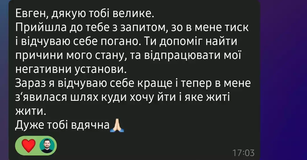 Впевнений що ви будете задоволені роботою зі мною, тому що коучинг це не просто надання послуг, це зв’язок, який формується на підтримці та довірі. Я не буду працювати з людьми які мені не імпонують, тому що в мене не буде бажання та мотивації допомагати. Але якщо ми знайшли один-одного то це метч, який гарантує результат. Я працюю з вашою свідомістю і інколи мені довіряють таємниці, які ніхто з рідних та близьких не знає. Так, таке моє покликання. Тому мені довіряють, і я вам теж зможу допомогти якщо ми отримаємо такий зв’язок побудований на довірі. Звичайно я зацікавлений у вашому результаті, так само як і ви.
